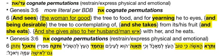 The other direction I would like to ask you to ponder has two sub-topics. The first is, the approach the Serpent used in the Garden with Havva/Eve. Remember this is not the tree of good and evil but the tree of the âknowledgeâ of good and evil. When we learn that something is âforbidden fruit,â our desire for the âhighâ that the fruit will bring is SO difficult to resist (back to our ×ת cognate permutation definition).