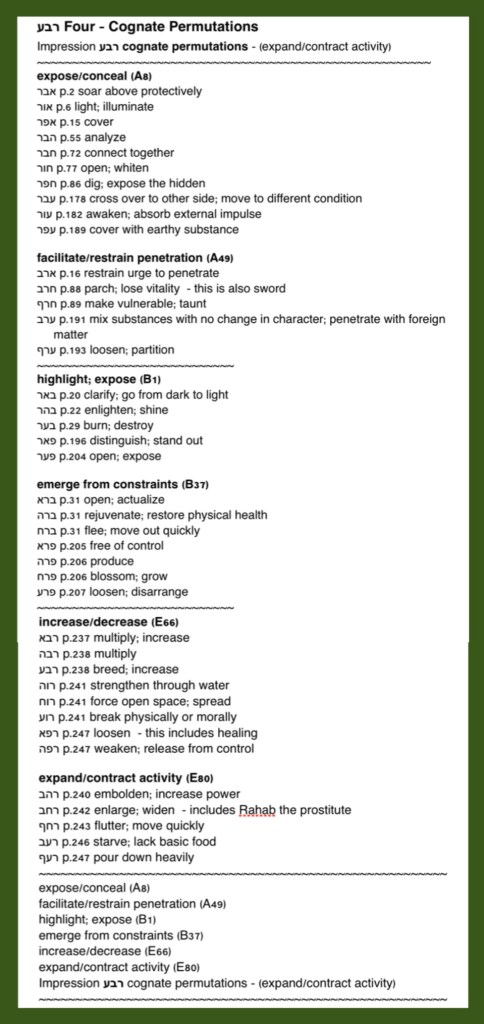 See the בחר choose/choice cognate permutation group meaning is (expand/contract activity), and it is in with other very important roots such as עברcross over to the other side (the root for Hebrew), רבע four/fourth, אור illuminate/light, חרב sword/lose vitality, עפר dust, and אפר ash. (As in ash to ash, dust to dust). See the list of roots below in the green box outline.