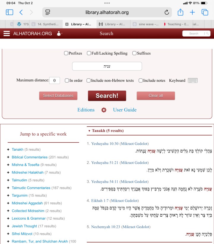 See that one common way of forming a noun from a verb is to add a Vav ו inside the root. Here we see that the noun “humility” ענוה is formed by adding the Vav ו within the root ענה. Remember that Vav ו is a labial and can be interchanged with Bet ב, which we recently were reminded is formed as an abbreviated prefix from ביתmeaning house. Think of it as someone having humility ענוה as being in the house of “being humbled” or “being humble” ענה. ((not to drift too far… Benner also notes adding a Yod י internally in the root. The Yod י is a palatal and thus similar in meaning to כ. EDBH indicates the prefix כ is a shortened form of the root כון. The root כון p.116means to prepare, and on p.299, EDBH indicates “The כ highlights an example for all to emulate.” It is most commonly translated as “like” or “as,” and in my literal translations from BDB I most always use “like,” but it is good to keep in mind this idea of “an example to emulate.” If we used this same root ענה and add a Yod י within, we see:))
